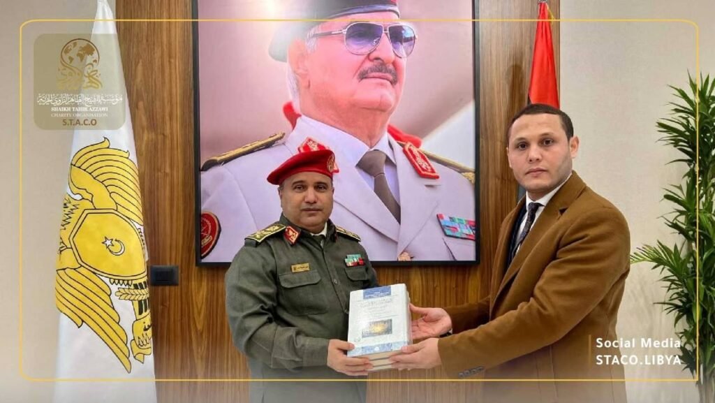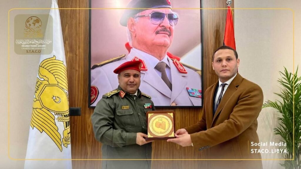 Libyan Lieutenant General Khairi Al-Tamimi, Secretary-General of the General Command of the Libyan Arab Armed Forces, presented a shield of thanks and appreciation to the management of Sheikh Taher Al-Zawi Foundation, Engineer Salem Al-Qoudi, in honor of the Foundation’s efforts in supporting work and relief in Libya.