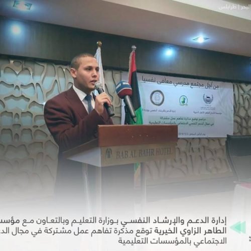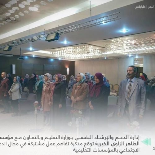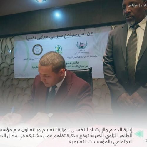 In a distinguished step, the Sheikh Al-Taher Al-Zawi Charitable Foundation, in partnership with the Department of Psychological Support and Guidance of the Ministry of Education, laid the foundation stone for building a good and sound youth imbued with the spirit of citizenship and the facts of peace in a healthy and cohesive society and with a strong social fabric, by providing psychological and social support to our children within educational institutions, where the Foundation signed Sheikh Al-Taher Al-Zawi Charity / STACO and the Psychological Support Department at the Ministry of Education, a memorandum of understanding for joint work in establishing projects related to the field of psychological support within educational institutions in various parts of Libya.
