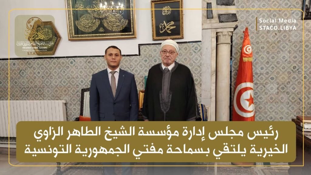As part of his official tour to Tunisia, Engineer Salem Al-Qamoudi, Chairman of the Board of Directors of the Sheikh Taher Zaoui Charitable Foundation, met with His Eminence Sheikh Hisham Muhammad Al-Mukhtar bin Mahmoud, Grand Mufti of the Tunisian Republic, at the Dar Al-Iftaa headquarters in Tunis, to discuss prospects for academic and scientific cooperation.