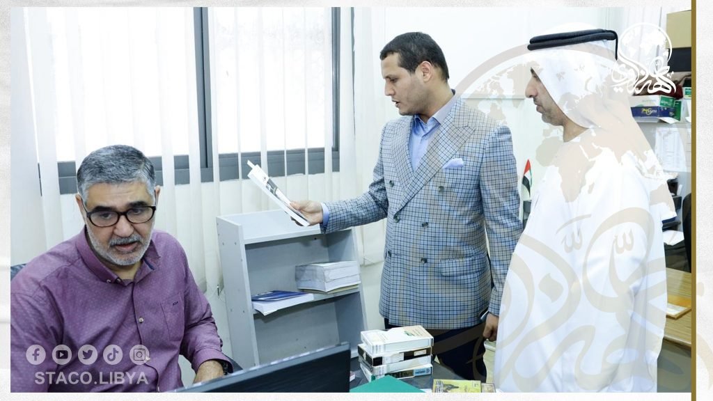 The Chairman of the Board of Directors, with those responsible for the Center, toured the libraries and publications, and learned about the process of preserving books and electronic archiving, stressing the necessity of benefiting from this scientific experience in the fields of scientific research in Libya, while the Director General of the Center, and the necessity of cooperation, coordination, and exchange of publications between the Center, and Sheikh Tahir Al-Zzawi charity organization.